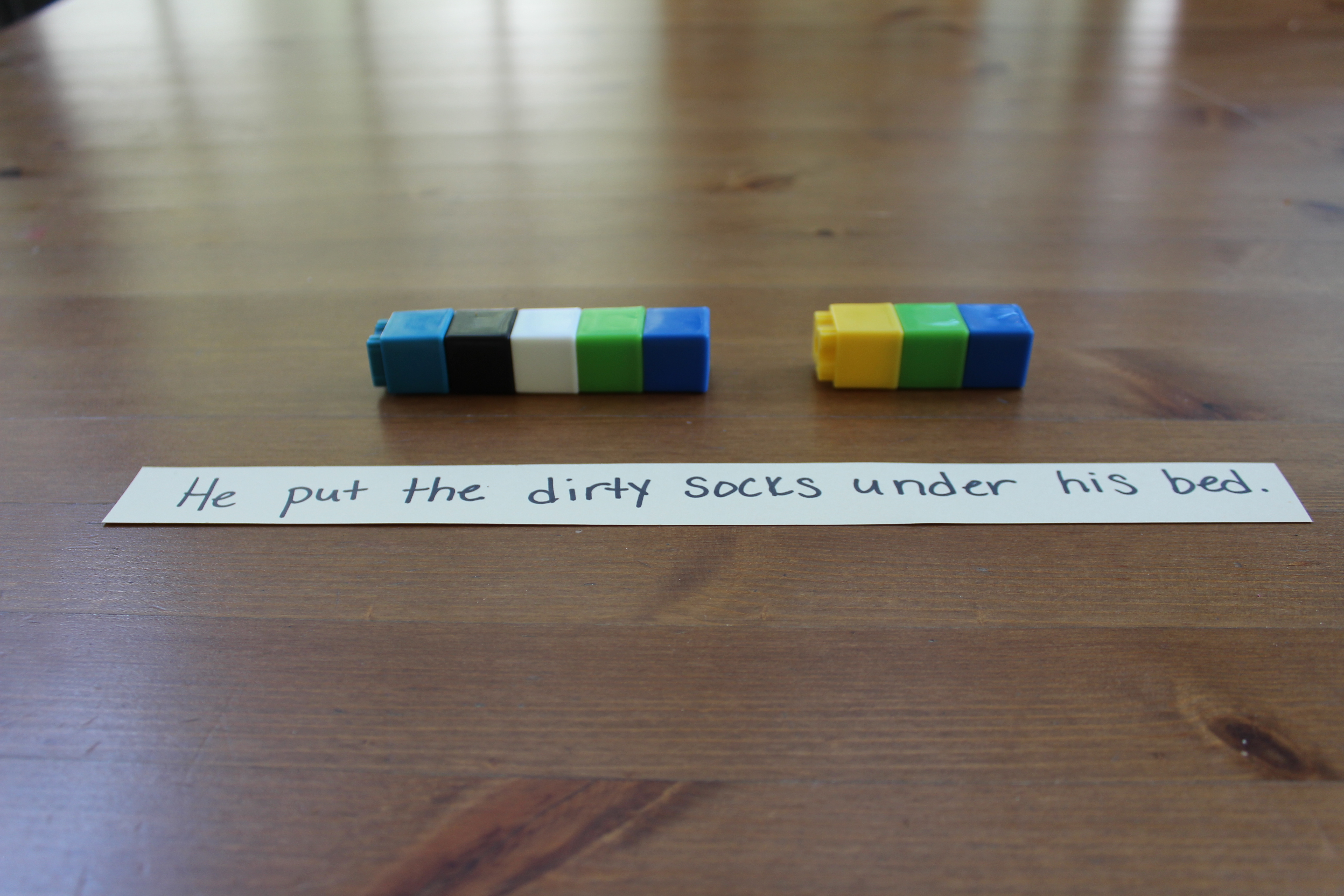 Using this color code, the first thing we used the cubes for was identifying parts of speech. I wrote sentences on a sentence strip and had my son place a cube on top of each word identifying it’s part of speech. Once each word was identified, he linked the cubes together to represent the sentence.